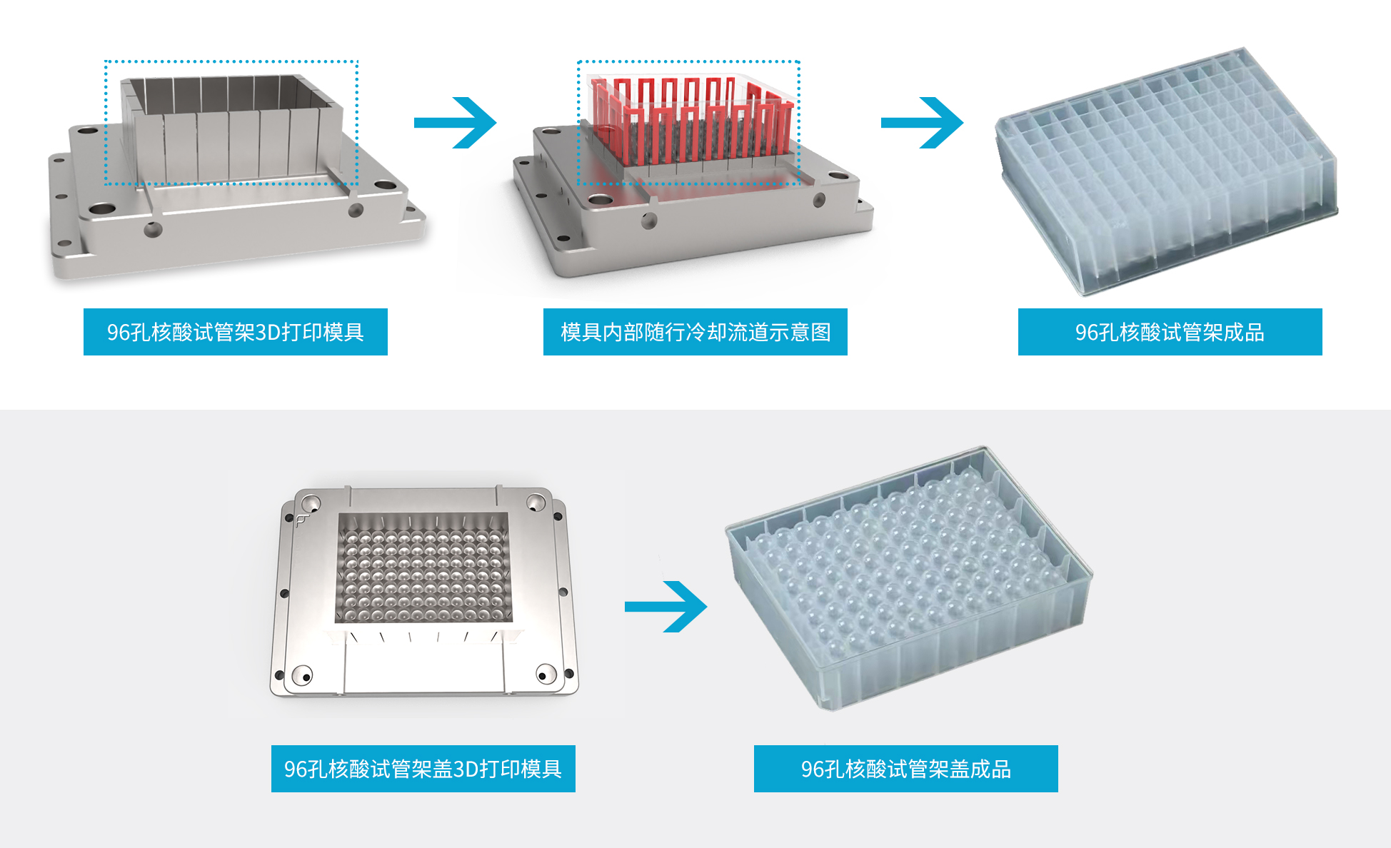 东莞市博通精密科技有限公司将人生就是博金属3D打印解决方案应用在核酸试管模具、96孔核酸试管架模具等产品上,使产品的冷却周期时间缩短1倍,生产效率大大提高,为抗疫前线全民核酸检测工作提供了有力的后备保障。