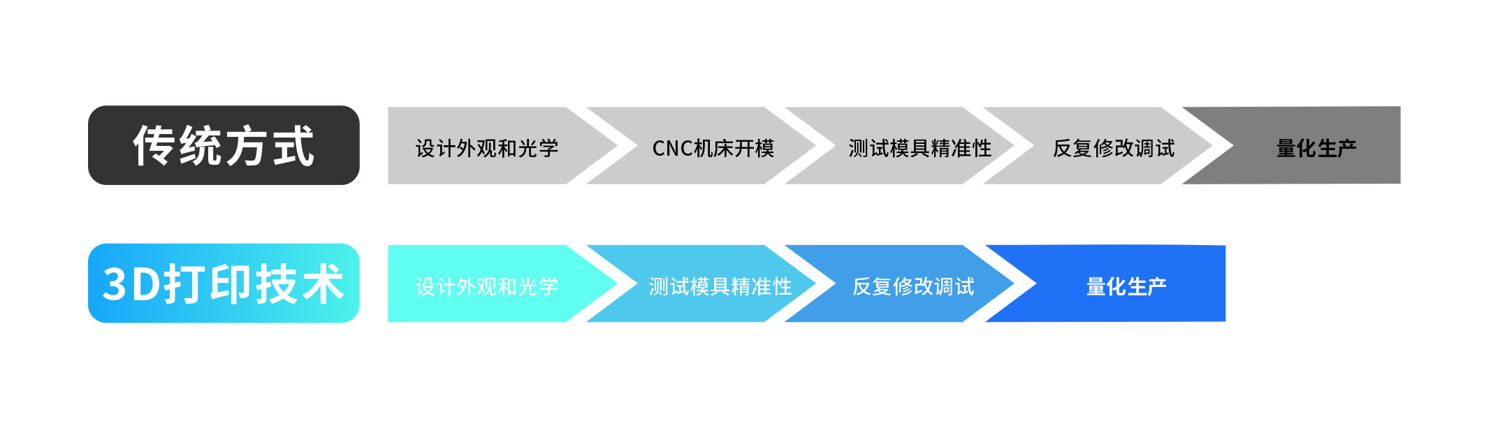 据介绍,一般车灯行业的模具开发时间45天左右,如果数据完全准确可以量产,如果数据有误差,则需要再等待7-10天修改模具。而采用3D打印技术则可以有效节省时间成本,产品开发周期较短,设计一旦完成第二天即可量产,后期如出现不匹配问题则可以直接修改电脑数据,无需等待开模。