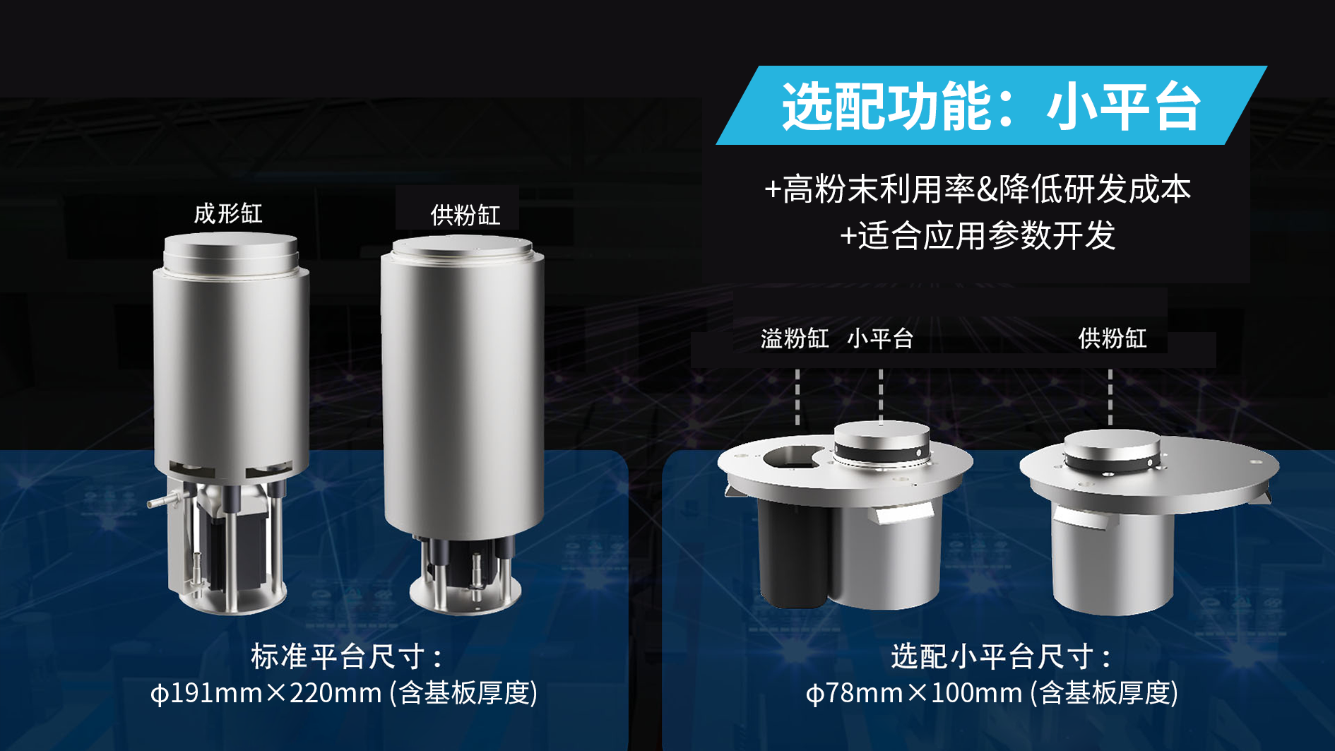 FS191M标配紧凑成形平台(尺寸:φ191mm×220mm),可选配小尺寸平台(尺寸:φ78mm×100mm),配合自研少支撑技术,节约科研成本,特别适用于新合金开发及稀有材料研究;