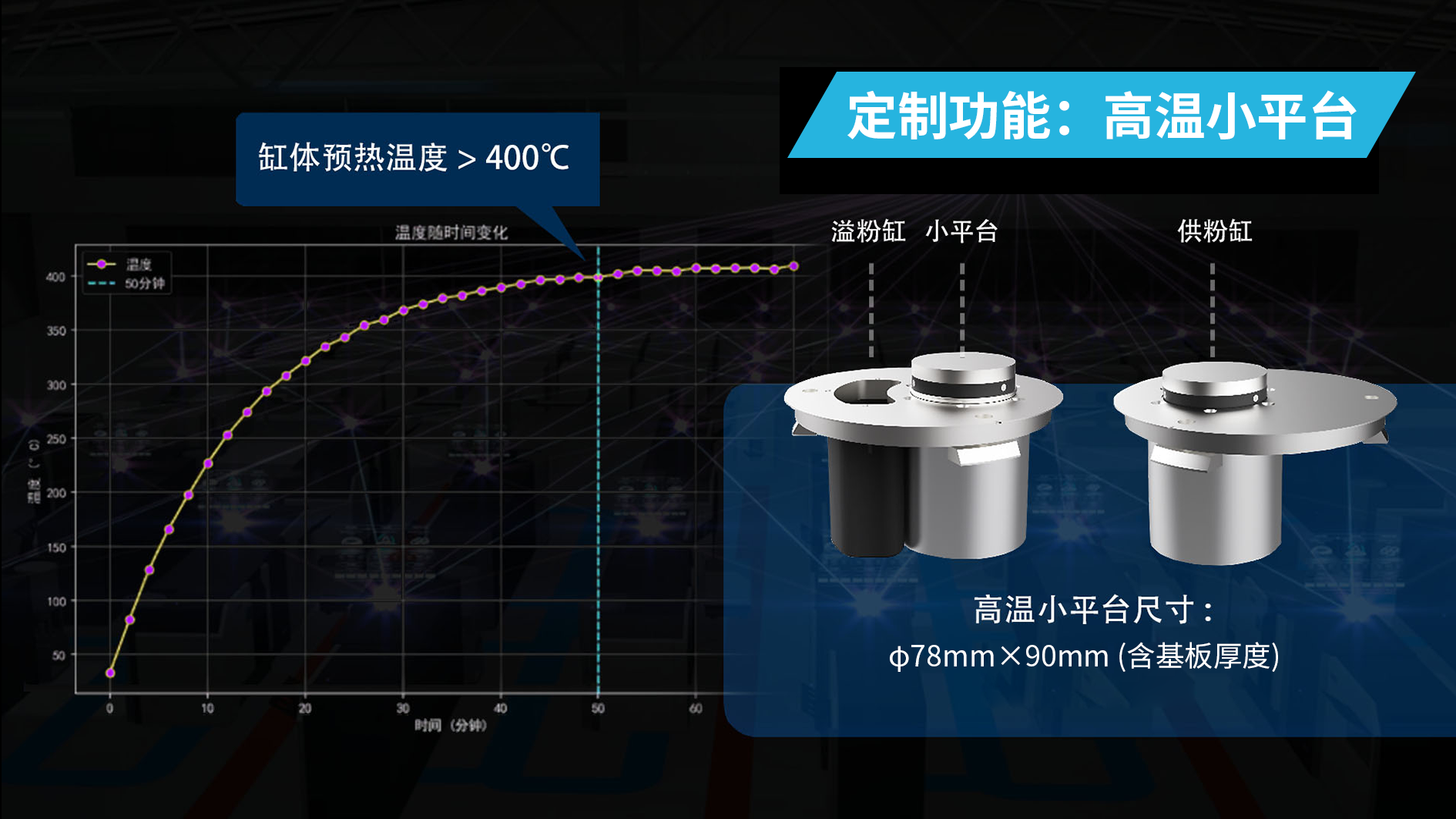 可定制超400℃高温小平台(尺寸:φ78mm×90mm),显著降低打印件中的残余应力,减少成形件变形、开裂等问题,支持更多高温材料工艺开发;