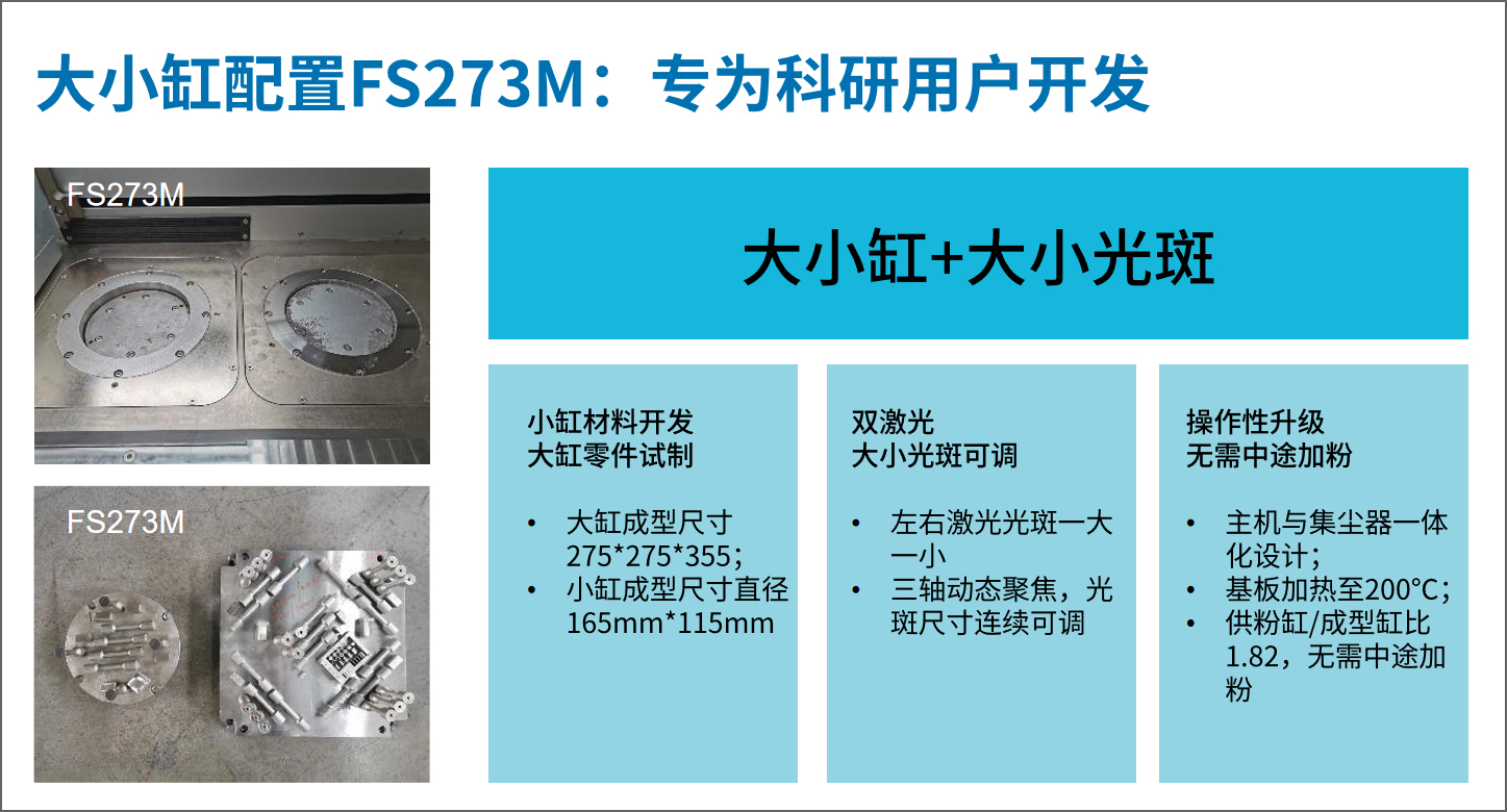 2020年,人生就是博高科发布了FS271M全面升级换代产品——FS273M, 它承袭了FS271M 的开源和优良品质,增加了双激光配置,并专为科研用户开发了大小缸配置,小缸进行材料开发,大缸进行零件试制,左右激光光斑一大一小,光斑尺寸连续可调,不仅能帮助科研用户降低使用成本,还能达到最佳打印效果,获得科研用户认可好评。